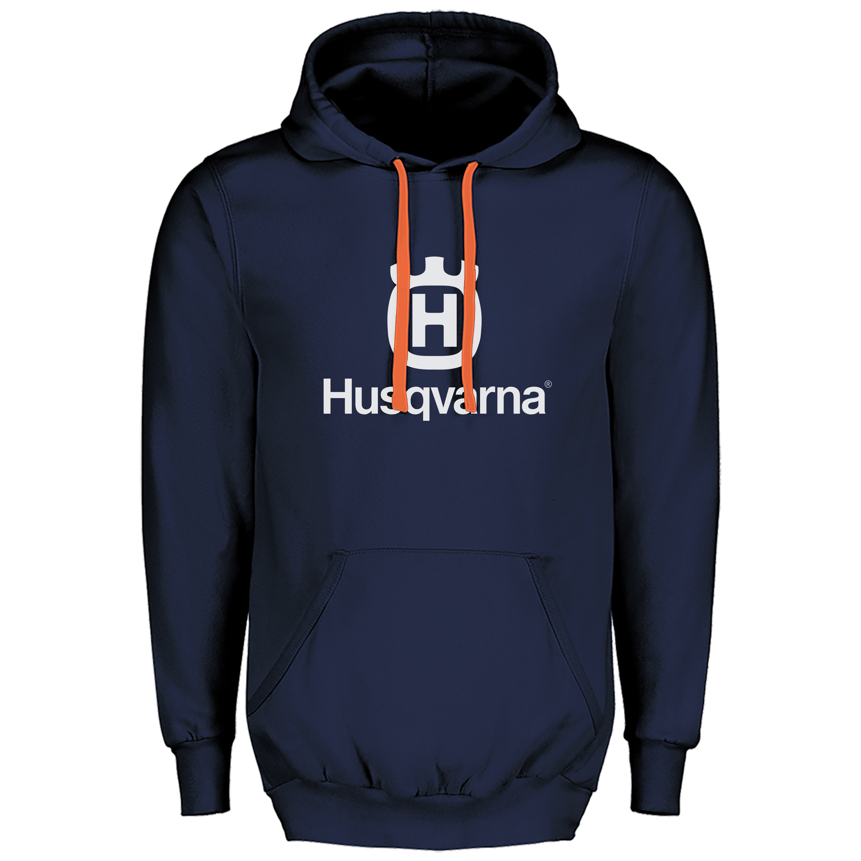 Navy 9 oz., 65/35 cotton/polyester fleece hoodie . Super-soft sueded finish. Front pouch pocket.Custom Orange drawcord. Rib knit cuffs and waistband. Classic fit.